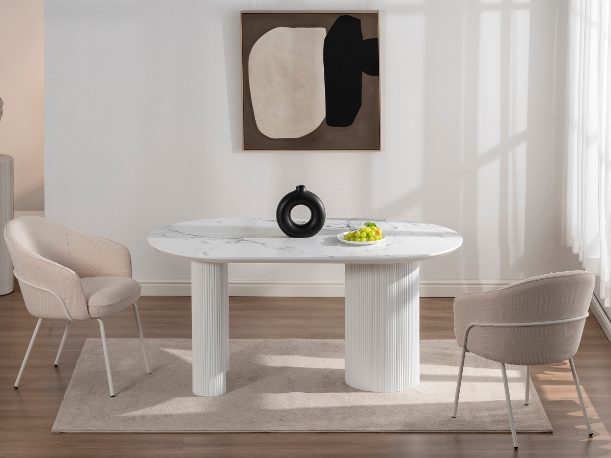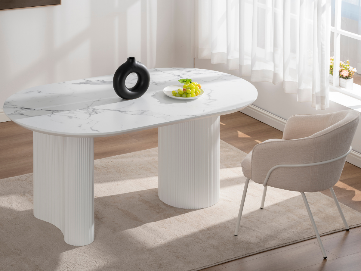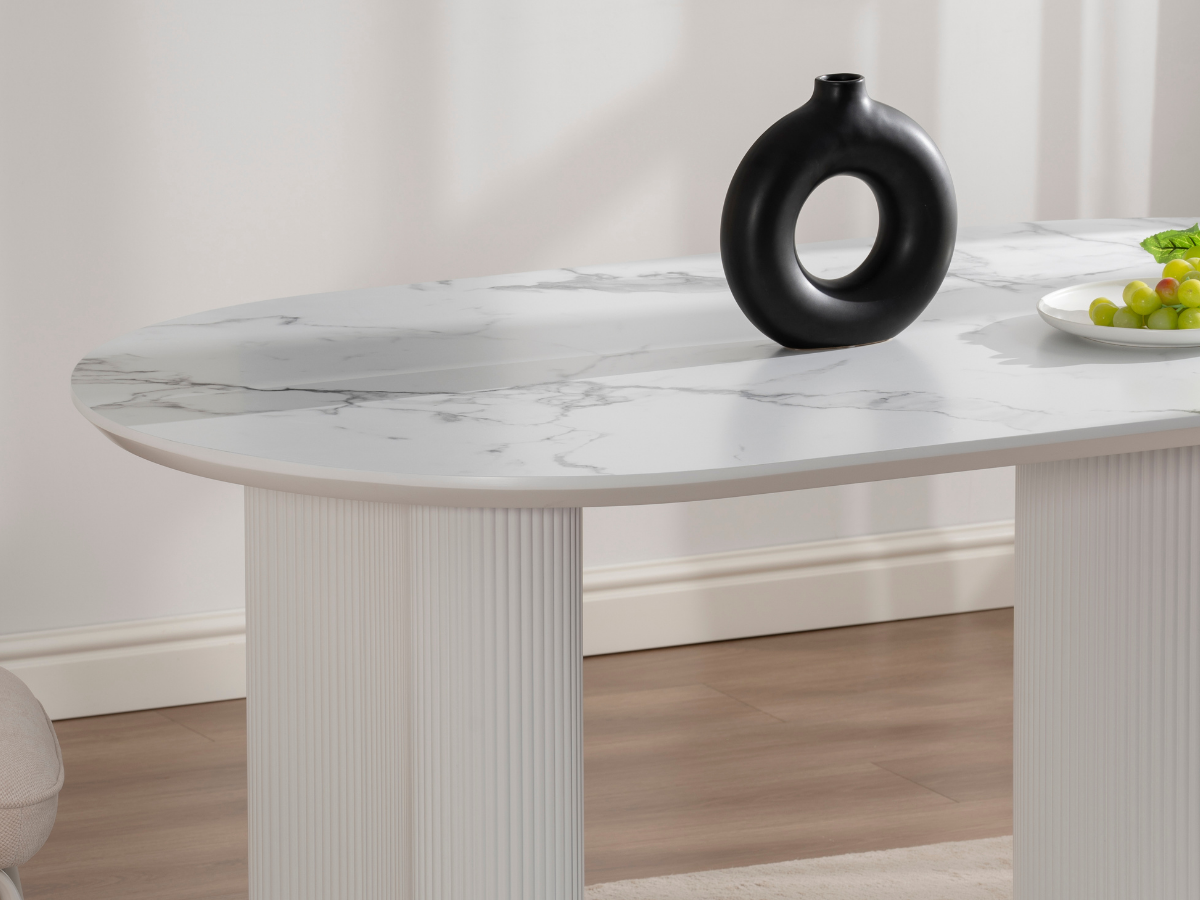 Der Porto Esstisch kombiniert moderne Formen mit der warmen Travertin-Optik und verleiht jedem Raum ein edles, architektonisches Flair. Seine markanten Rillenfüße und die ovale Tischplatte schaffen eine harmonische Balance zwischen Design und Funktionalität – ideal für stilvolle Essbereiche und offene Wohnräume.