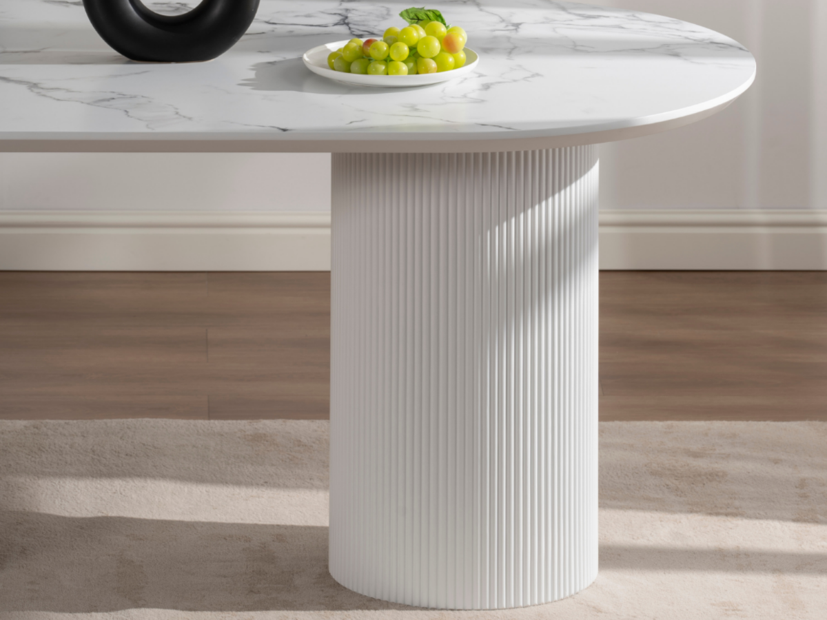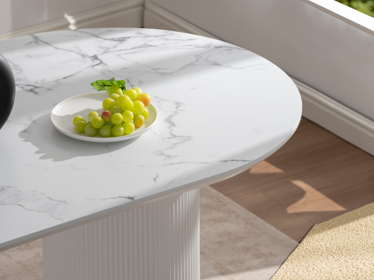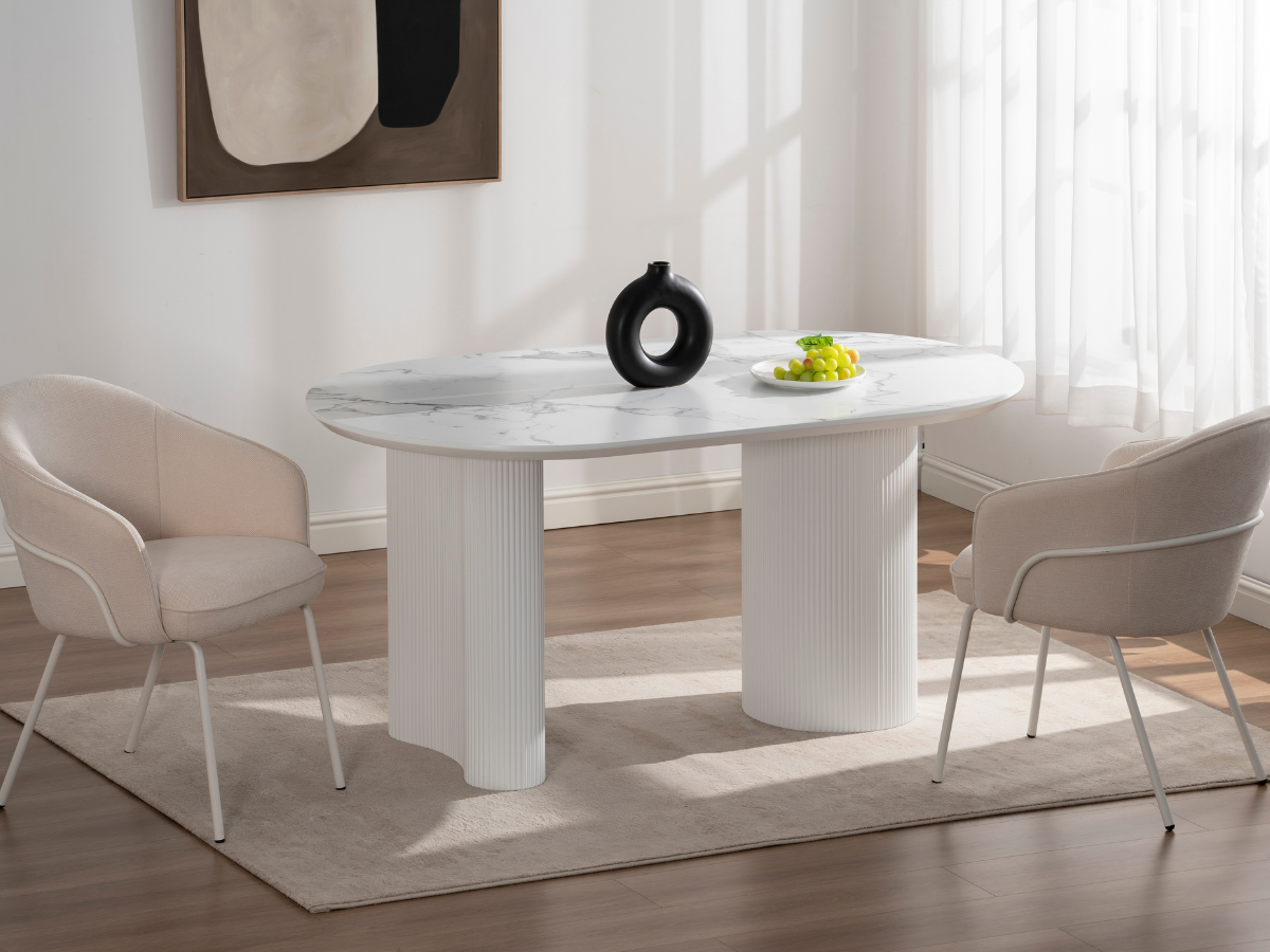 Der Porto Esstisch kombiniert moderne Formen mit der warmen Travertin-Optik und verleiht jedem Raum ein edles, architektonisches Flair. Seine markanten Rillenfüße und die ovale Tischplatte schaffen eine harmonische Balance zwischen Design und Funktionalität – ideal für stilvolle Essbereiche und offene Wohnräume.