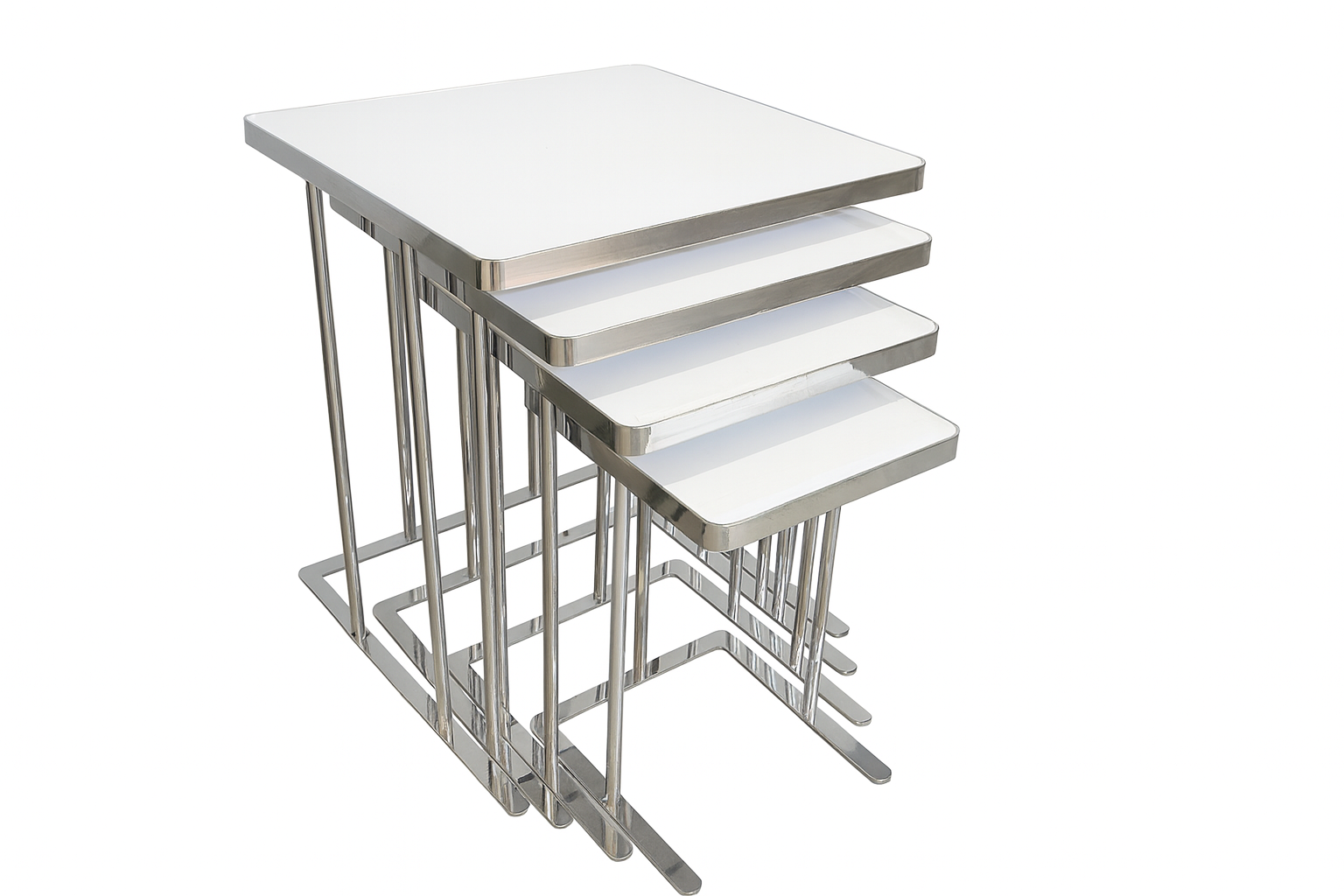 Die vier unterschiedlich großen Tische lassen sich platzsparend ineinander schieben. Bei Bedarf bieten sie zusätzliche Abstellfläche, während sie im zusammengeschobenen Zustand kaum Platz beanspruchen.