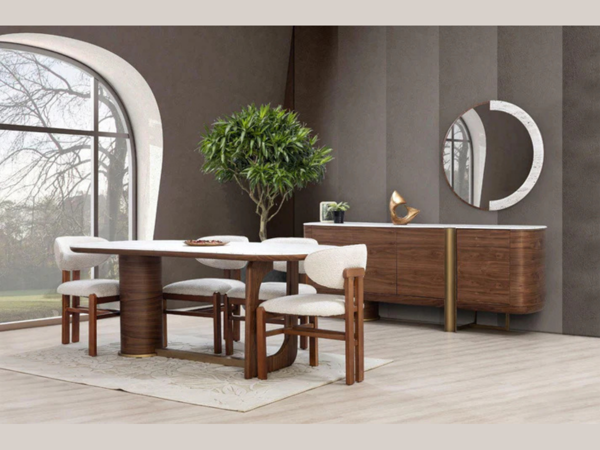 Das stabile Untergestell aus warmem Holzdekor sorgt für eine solide Konstruktion und fügt sich perfekt in jeden modernen Wohnstil ein. Ideal für Familienessen, Gästeempfang und stilvolle Wohnkonzepte.
