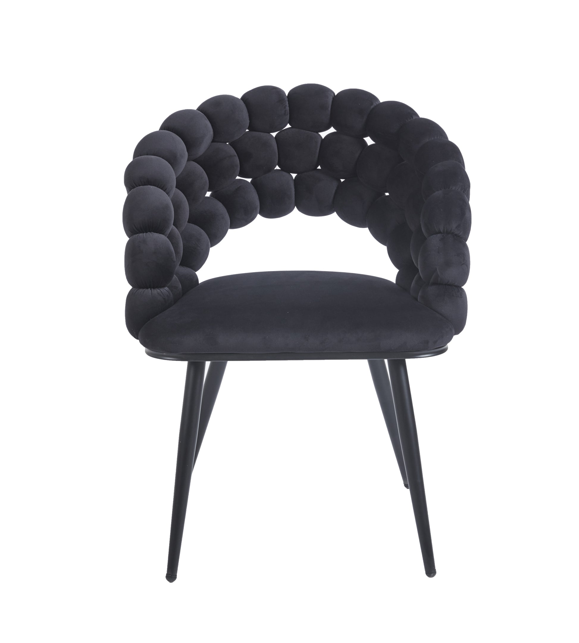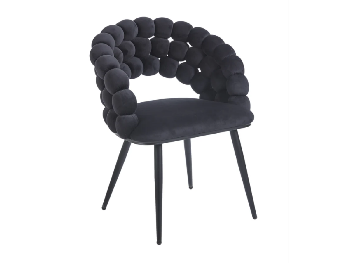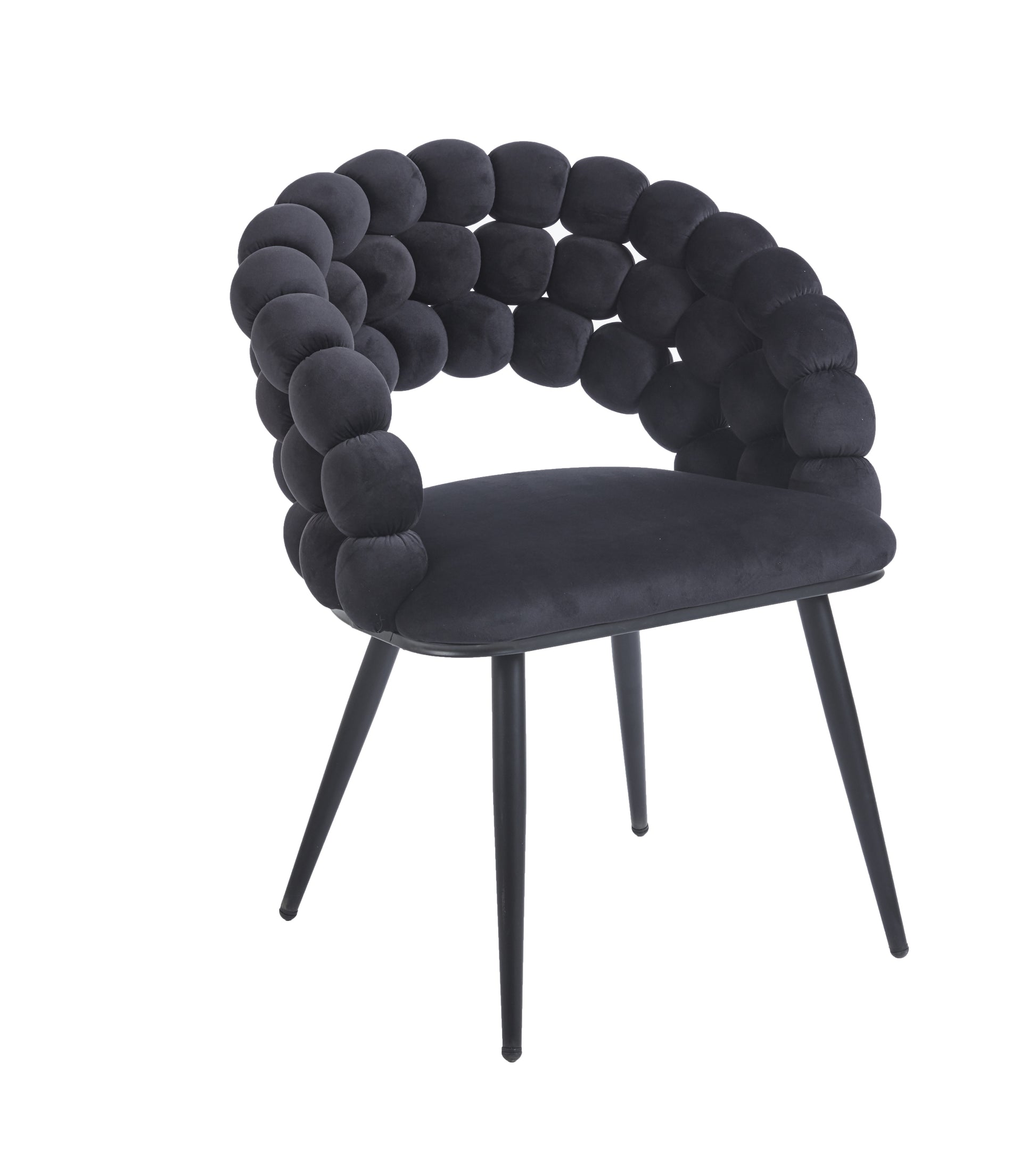 Der Bezug in Schwarz verleiht dem Stuhl eine zeitlose Eleganz und lässt sich vielseitig kombinieren. Das stabile schwarze Metallgestell sorgt für Robustheit und lange Haltbarkeit.