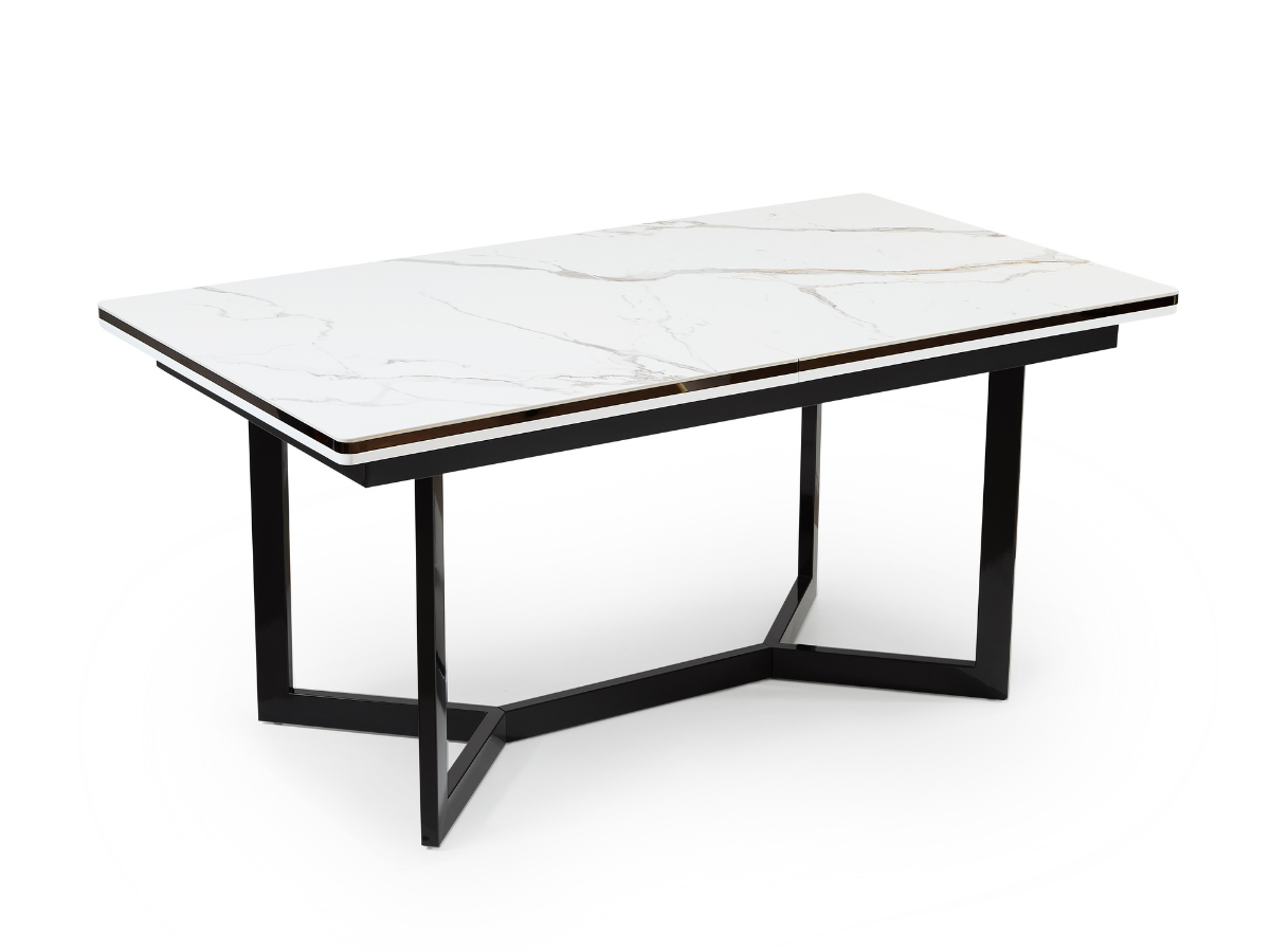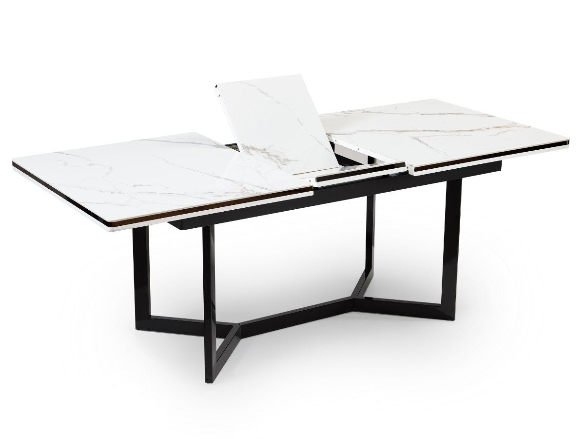 Der Seneca Esstisch in Schwarz vereint moderne Eleganz mit höchster Funktionalität. Die edle schwarze Oberfläche mit einem feinen Keramikmuster und die wählbaren Beinausführungen in Gold oder Silber machen diesen Esstisch zu einem luxuriösen Mittelpunkt Ihres Esszimmers. Geschlossen bietet er eine Fläche von 160 cm, während er geöffnet auf beeindruckende 200 cm erweitert werden kann.