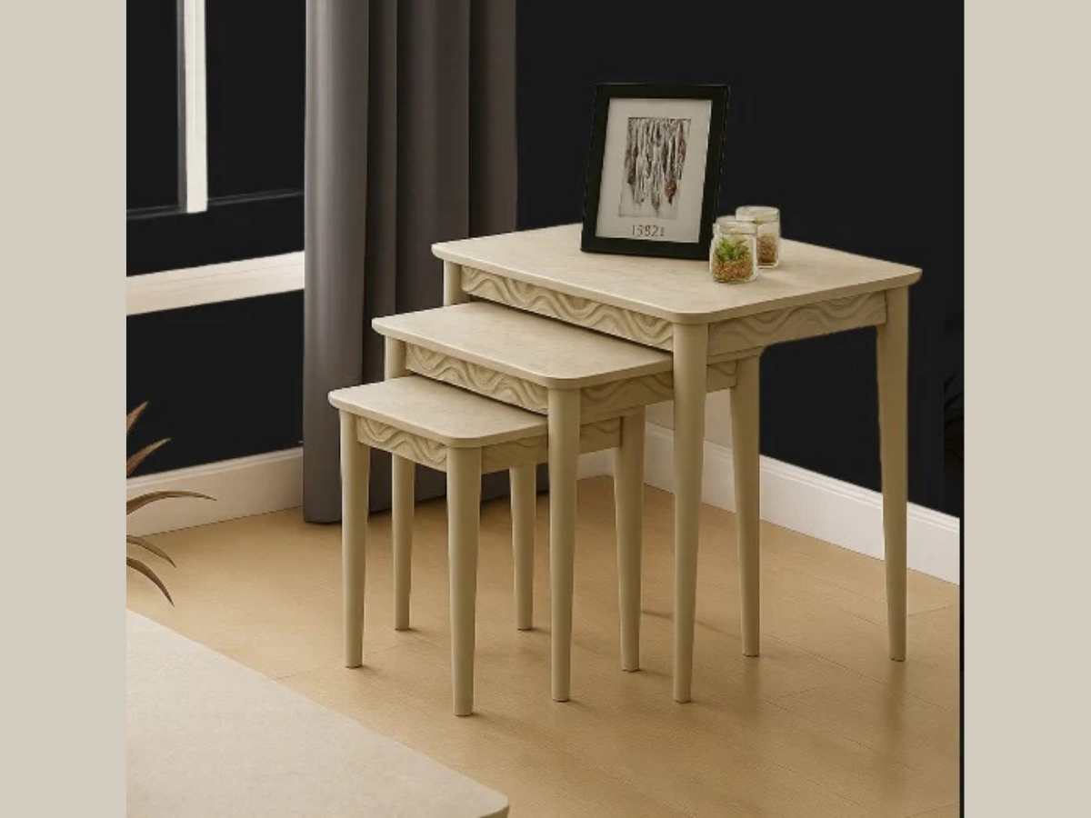 Das Surf Beistelltisch-Set bringt mit seinen wellenförmigen Kantendetails und der hochwertigen Travertin-Optik eine moderne Eleganz in Ihre Wohnräume.