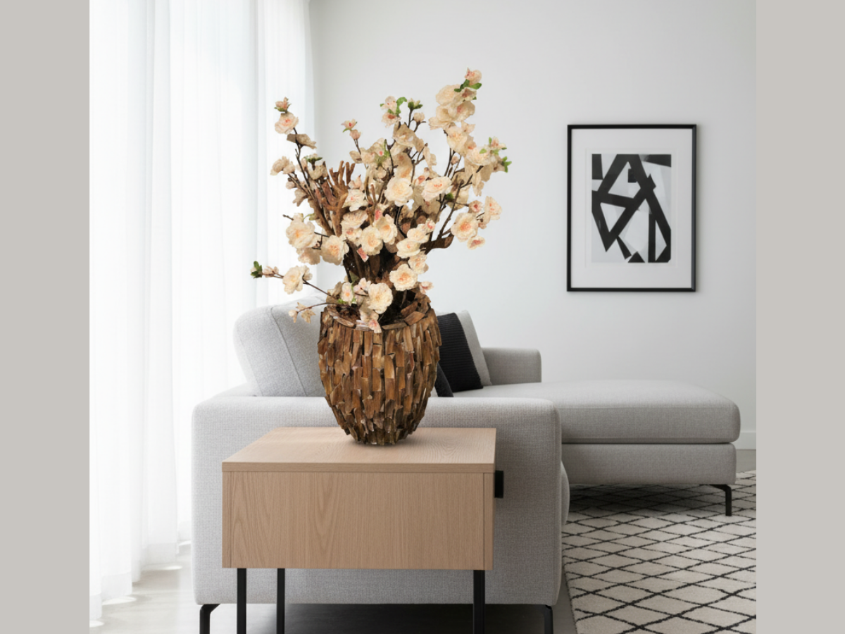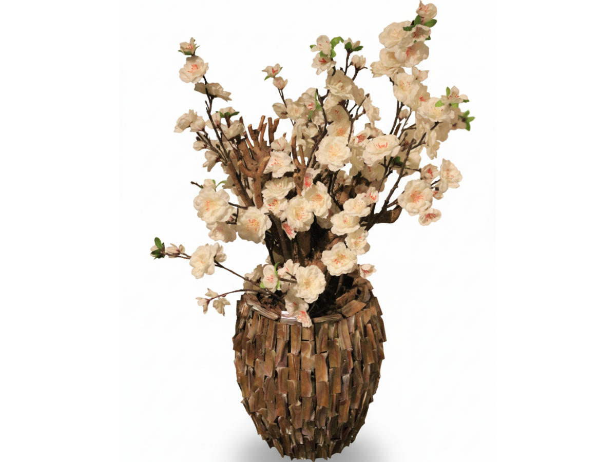 Naturgetreue Kirschblütenzweige in einem dekorativen Topf mit Muschel-Mosaik. Langlebig, pflegeleicht und sofort einsatzbereit – ideal für Sideboard, Esstisch oder Empfang.